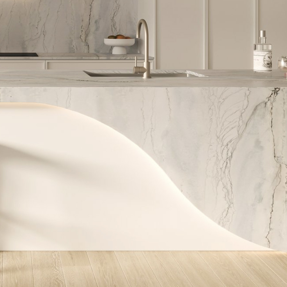 The cabinetry is streamlined and handle-less, finished in matte white or warm wood veneers, creating a clean, minimalist look.